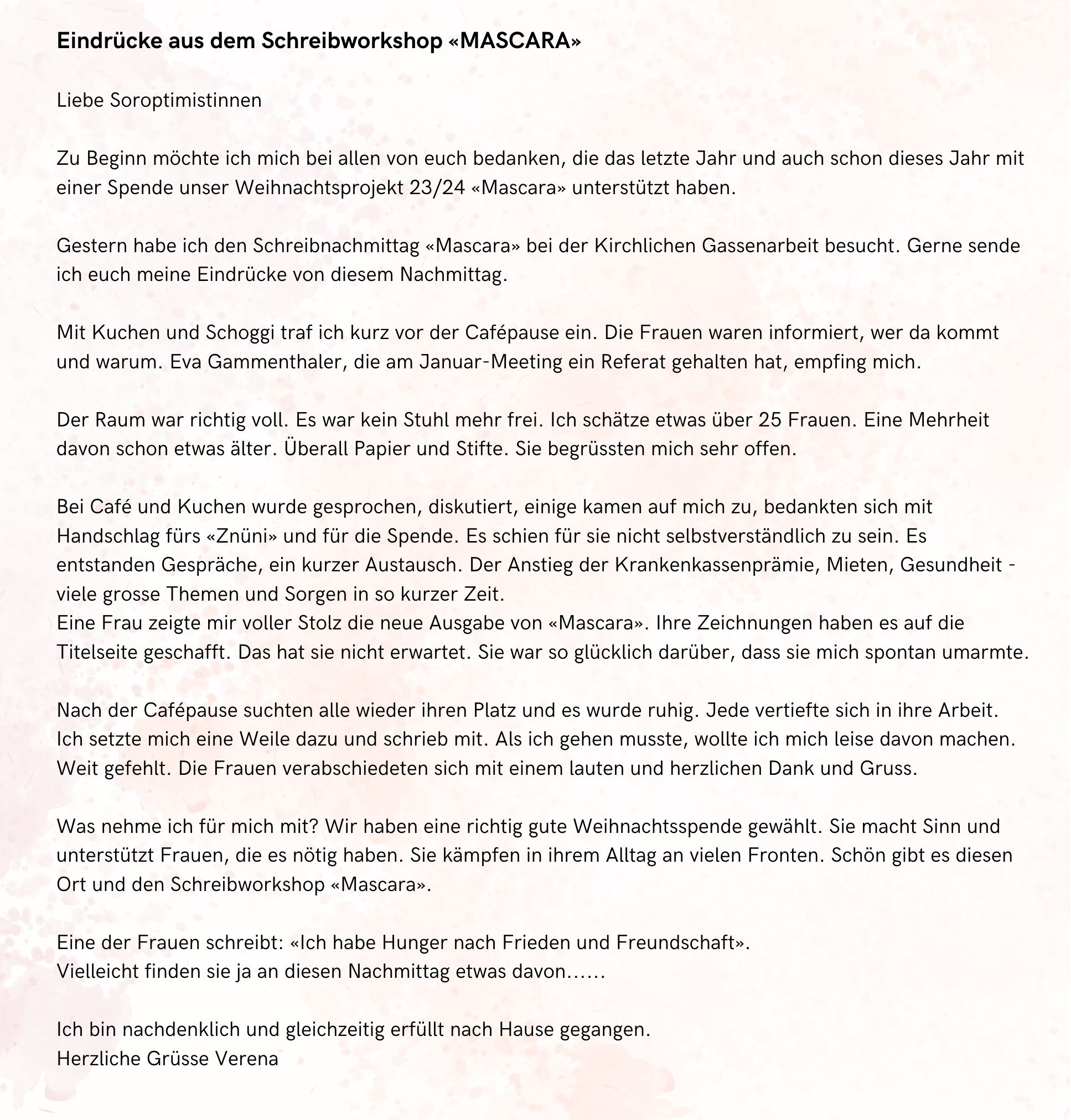 Mit dieser Spende möchten wir dazu beitragen, dass das Projekt «MASCARA» aufrechterhalten werden kann – damit Frauen in schwierigen Lebenssituationen in den vierzehntäglich stattfindenden Workshops eine kurze, aber sehr wertvolle Auszeit aus dem Alltagsstress finden und in geschütztem Rahmen ihre Erlebnisse und Emotionen ausdrücken können.