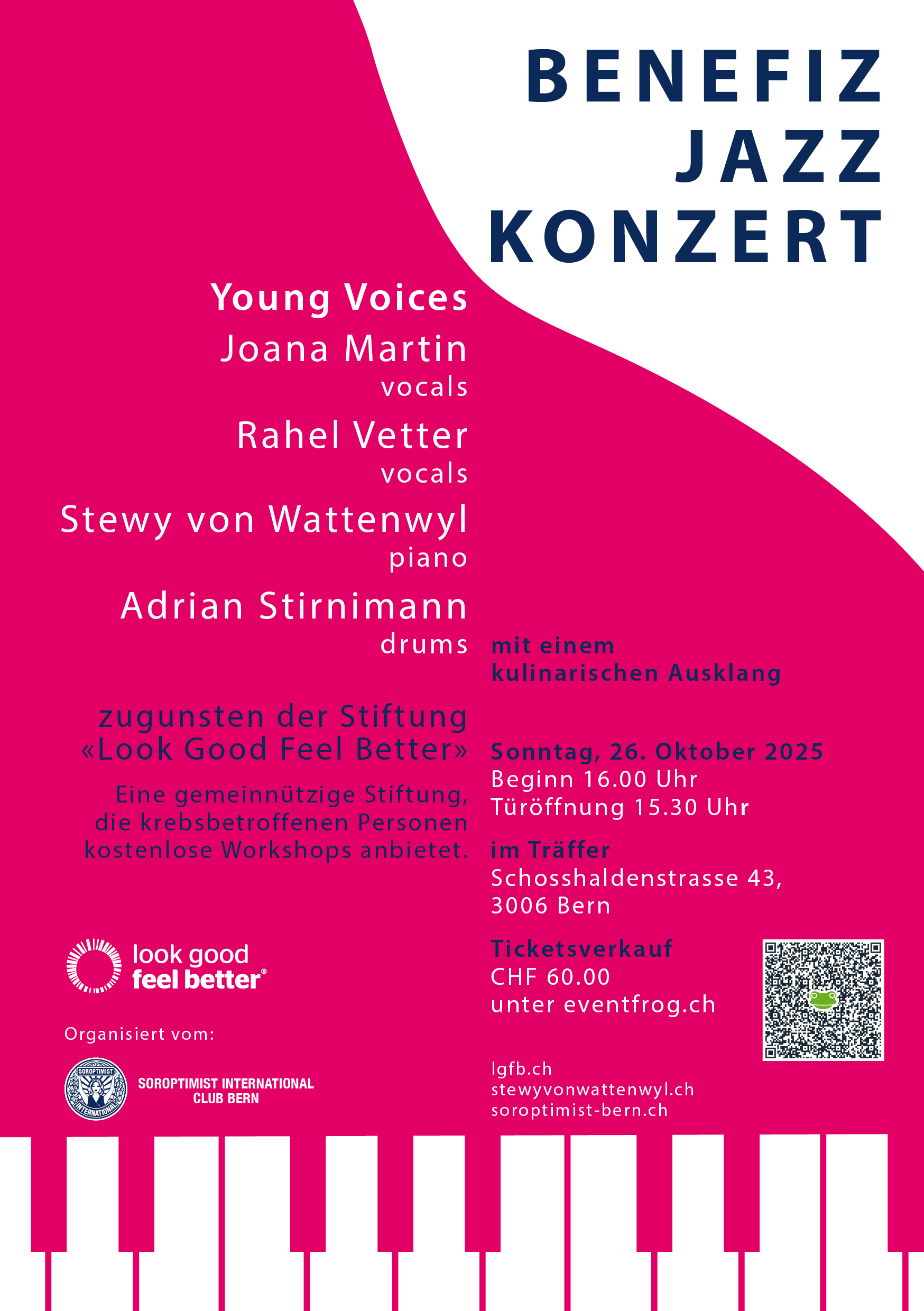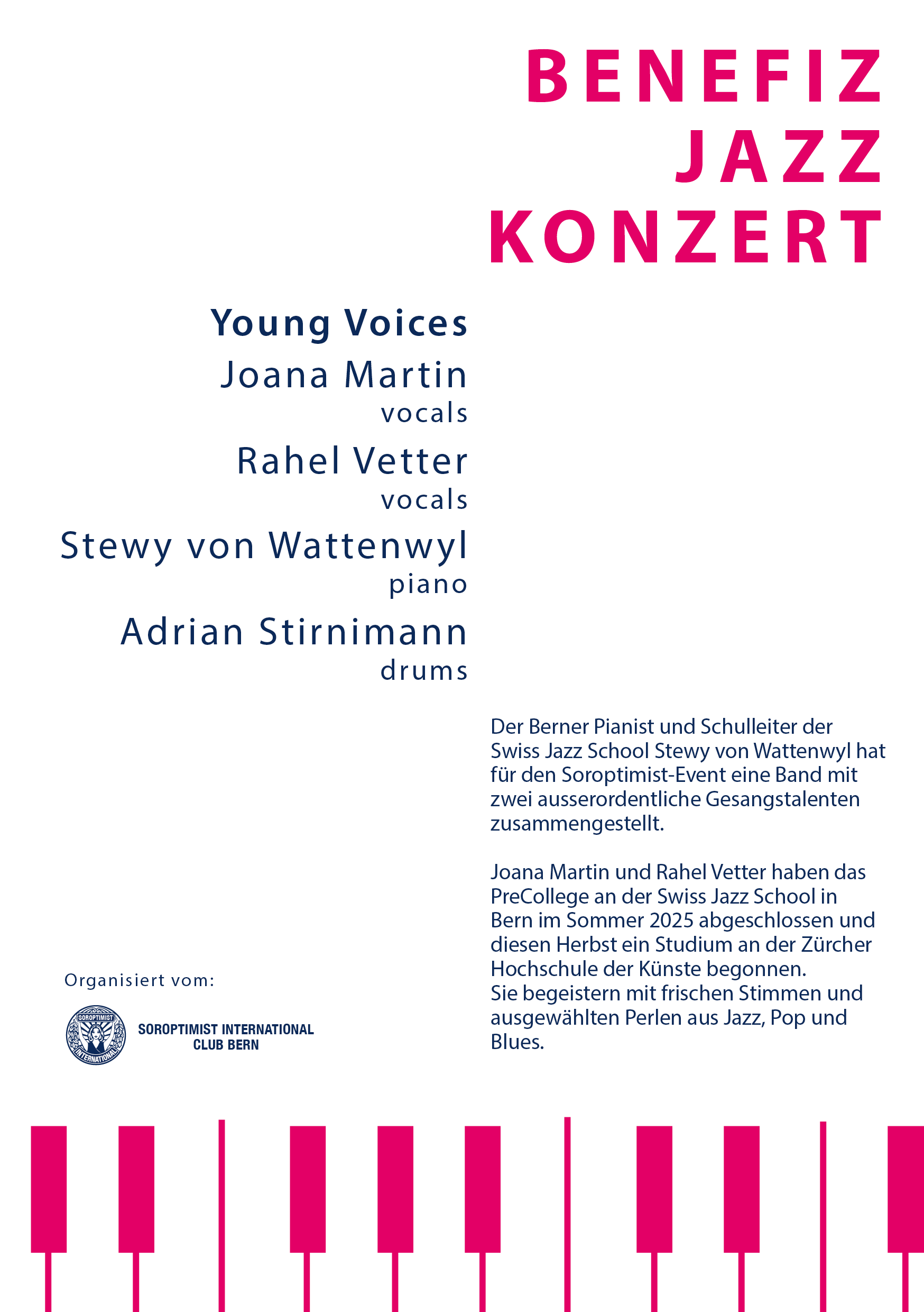 Dank des renommierten Jazzpianisten und der charismatischen Jazzsängerin konnten wir mit dieser Veranstaltung Geld für das Projekt AppElle! sammeln. AppElle! ist die 24h-Hotline der Frauenhäuser des Kantons Bern, welche gewaltbetroffenen Frauen und Kindern in akuten Notsituationen unbürokratisch und unentgeltlich Beratung, Schutz und Unterkunft anbietet.